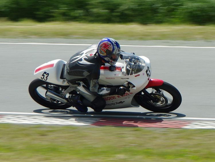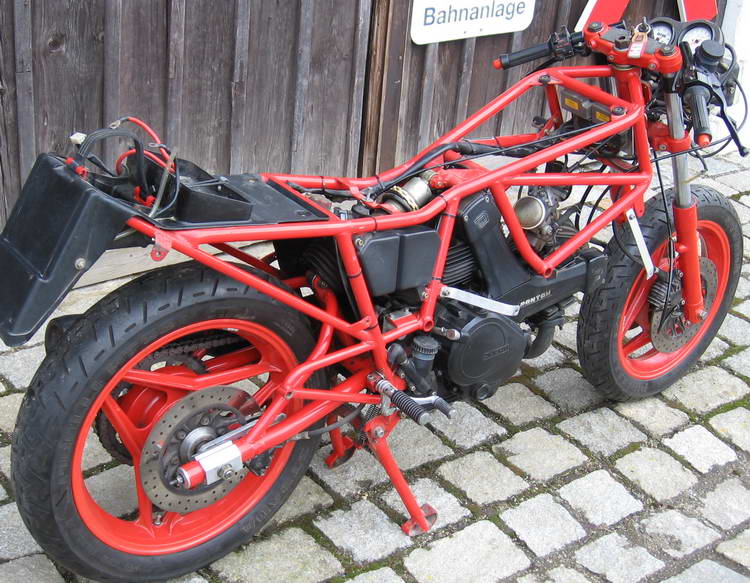 Hans Passberger vom 31.07.2009 >>Diese 500er Renn-Pantah habe ich selbst aufgebaut. Der Rahmen ist Eigenbau und der Motor wurde von Werner Kaiser (WEKA) gemacht. Beim ersten Einsatz im Mai habe ich bei Grab the Flag gleich die Pole-Position in der hart umkämpften "Classic500" errungen. Bei den beiden Rennen belegte ich jeweils den zweiten Platz. Beim zweiten Einsatz beim Classic-Grand-Prix in Schleiz belegt ich wieder die Pole. Beim Rennen lag ich dann bis zur letzten Runde mit ca. 20 Sekunden in Führung, bin dann aber wegen einem Batteriedefekt ausgefallen. Man sieht also, das Motorrad fährt sich gut und der WEKA-Motor hat ordentlich Leistung. Diese Maschine ist meine eigene Interpretation einer Retro-DUC! Der Höcker stammt von einer 125er und die Verkleidung ist eine TT-Verkleidung aus Italien. Inzwischen ist auch ein Megaphon verbaut, das sieht klassischer aus und hört sich auch so an. Das Gewicht liegt bei 127 kg.<< |