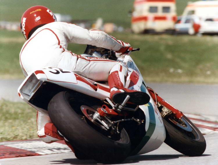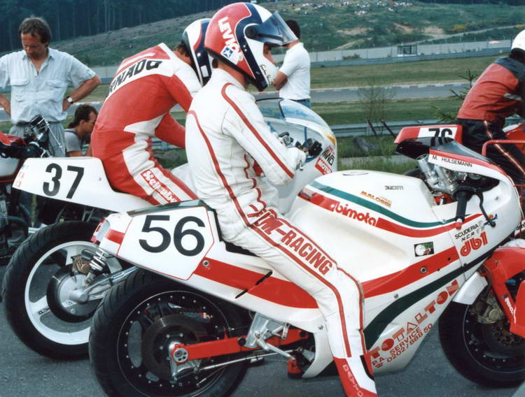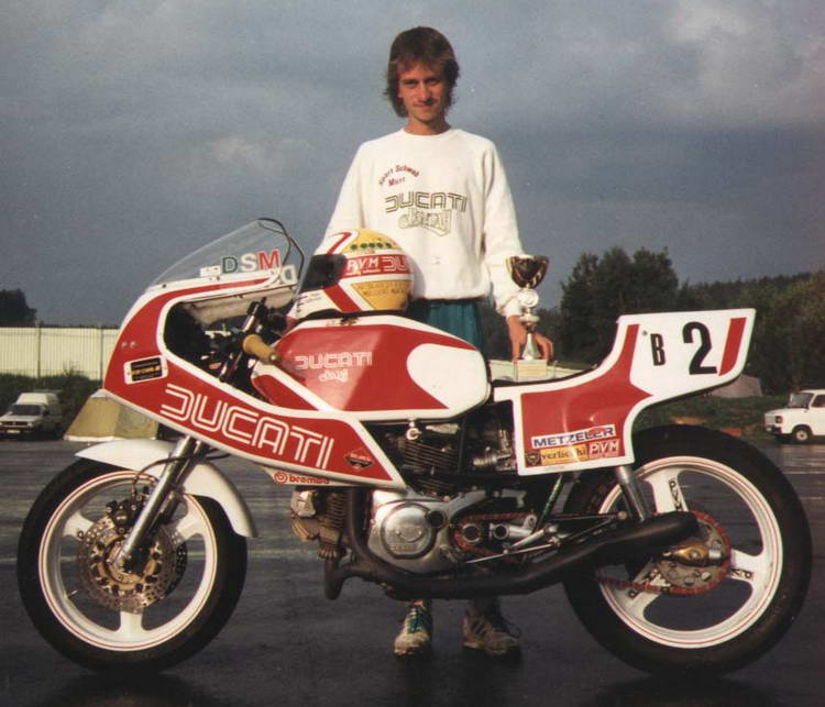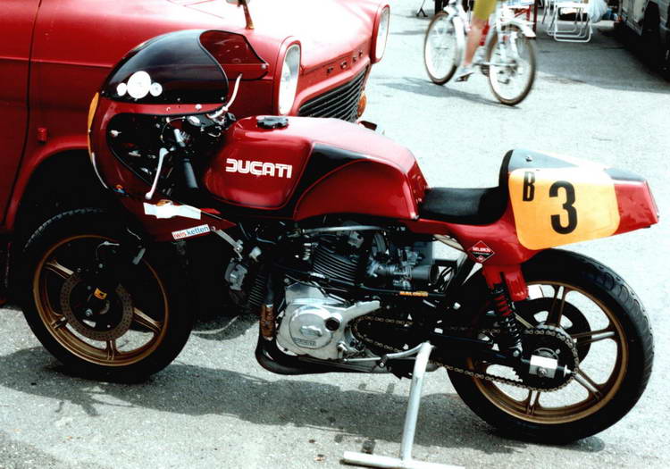 Peter Laibacher vom 01.06.2007: >>Ich habe diese Duc im Frühjahr 1984 von Helmut Knatz gekauft. Er war damit 1980 und 1981 Deutscher Motorradrallymeister. Der Brief hat eine Erstzulassung vom Januar 1980 und damit ist sie wahrscheinlich eine der allerersten Pantahs in Deutschland. Sie hatte sogar noch Speedline-Sternfelgen drin. Ich habe die Pantah dann von 1984 bis 1990 bei zahlreichen Clubrennen in Europa eingesetzt und sie individuell aufgebaut. Zu den Umbaumaßnahmen zählen u. a. Magnesiumräder von PVM, vordere Bremsscheiben und Fußrasten, Magnesium-Gabelbrücken mit Alusteuerrohr, Fournales-Dämpfer, längere Schwinge, versetzte Federbeinaufnahmen, Einmannhöcker, Mahle-Kolben, Werksnockenwellen mit geänderten Steuerzeiten, WBO 2in1 Auspuffanlage und viele weitere kleine Details. Mit der Pantah habe ich bei Clubrennen nie einen schlechteren Platz als Position 6 belegt. In Hockenheim konnte ich zweimal gewinnen und in Zeltweg einmal. Weiterhin fuhr ich auch bei Zuvis und bei einem BOT-Lauf mit ihr. Bei Rolf im Brahm's Ducati Kalender war ich mir ihr im Februar 1990 zu sehen.<< |