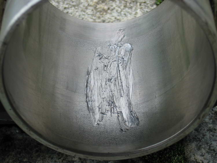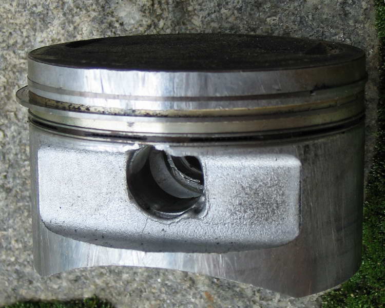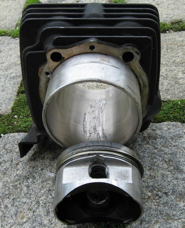 Pantah-Schrott Teil 2 Das kommt dabei heraus, wenn der Kolbenbolzen am stehenden Zylinder einer 91er 750 SS auf "Wanderschaft" geht. Da hat sich wohl ein Mitarbeiter im Ducati-Werk besonders wenig Mühe beim Einsetzen des Sicherungsringes gegeben. |