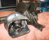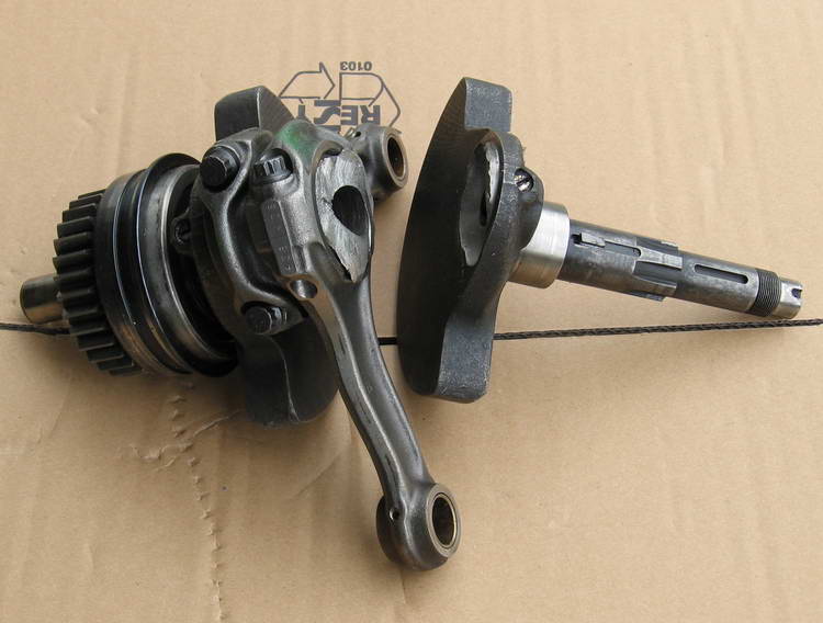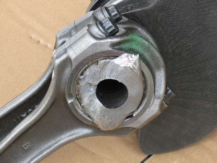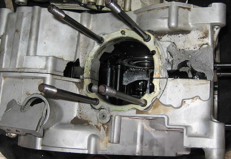 Pantah-Schrott Teil 4 750er SS Baujahr 1991: Das Pleuel des stehenden Zylinders ist im Fahrbetrieb bei ca. 80 bis 100 km/h ohne Vorwarnung gerissen. Der Pleuelstumpf hat sich nach ein paar Umdrehungen im Motorblock verkeilt und durch Blockieren des Hinterrades für einen heftigen Abflug in einen Acker gesorgt. |